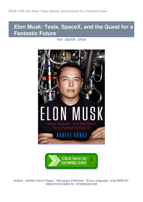 Ashlee vance is a technology journalist. Ebook pdf free download elon musk by ashlee vance is now available on freebooksmania this is based on elon musk biographythis is the biography of billion dollar engineer owner of tesla inc. Tesla spacex and the quest for a fantastic future veteran technology journalist ashlee vance provides the first inside look into the extraordinary life and times of silicon valleys most audacious entrepreneurwritten with exclusive access to musk his family and friends the book traces the entrepreneurs journey from a rough upbringing in south africa to the pinnacle of the. Download elon musk by ashlee vance pdf free full text complete ebook in mobikindle epub and pdf formats.